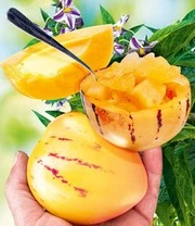 De meloenpeer Sugar Gold draagt de hele zomer lang suikerzoete, lekkere, naar meloen en peer smakende reuze vruchten. ‘De vrucht van de meloenpeer (solanum muricatum) is goudgeel met paarse strepen, is zo groot als een peer en heeft de vorm van een meloen. De rijpe peppino vruchten kunnen met schil worden gegeten. De meloenpeer „Sugar Gold“ heeft een bossige, licht hangende groei en is daarom ook goed geschikt voor bloembakken en een pot. Zeer decoratief, zelfbestuivend en snel groeiend!